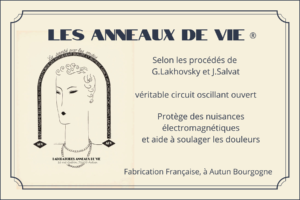 Depuis 2009, nous disposons d’un laboratoire de fabrication dédié aux produits de type Lakhovsky, colliers, bracelets, ceintures « Anneaux de vie »® qui sont en vente en direct à la boutique : 03 85 82 47 71, et sur notre page dédiée aux commandes (nos deux sites de vente ligne étant en maintenance cet été ) ;